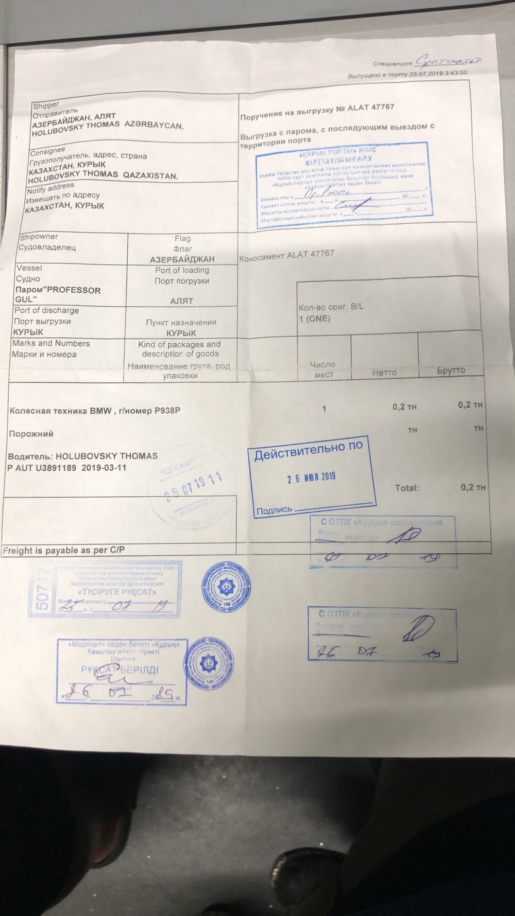 Ca. 24 Stunden nach dem Ablegen lief das Schiff in den brandneuen Hafen von Aqutau ein. Leider bedeutete das nicht, dass wir das Schiff verlassen durften, denn es kamen Soldaten, ein Schäferhund und 2 Beamte mit Koffern an Board. Es dauerte fast 3 Stunden, bis die Soldaten beliebiges Gepäck durchsucht haben und die beiden Beamten jeden einzelnen Passagier in ihrem mobilen Büro registriert und fotografiert haben. Für uns war es das Wichtigste, dass wir einen Zettel mit sechs Stempeln erhalten haben, der uns zum Verlassen des Hafens berechtigte.