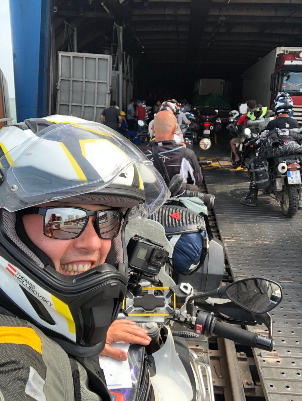 „Maybe tomorrow“ hörten wir dann schlussendlich 3 Tage in Folge, bis dann am Mittwoch den 24.7. gegen 7 Uhr früh der ersehnte Anruf kam, dass das Schiff in 2 Stunden anlegen wird. Gegen halb 10 waren wir am Hafen südlich von Baku wo es erstmal wieder Warten hieß. Die Zeit verging sehr schnell, da immer mehr europäische und amerikanische Backpacker, Fahrrad- und Motorradfahrer eintrafen und man schnell in Gespräche verwickelt wurde. Eines schon vorweg: im Laufe der nächsten 30 Stunden entstanden richtig nette Bekanntschaften und alle 12 Motorradfahrer tauschen nun in einer gemeinsamen WhatsApp-Gruppe Informationen und Fotos aus.