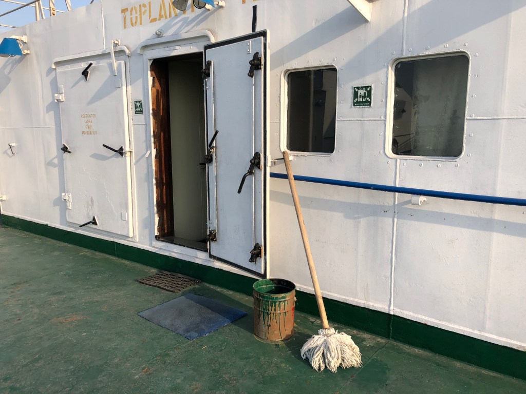 Nach dem chaotischen Safety Check des Reisegepäcks und Überprüfung der Dokumente durften wir endlich aufs Schiff. Nach dem Parken und Sichern der Motorräder konnten wir endlich an Deck gehen und uns um unsere Kabinen kümmern. Wie in den Berichten beschrieben, ist das Schiff aus Sowjetzeiten und auf den Komfort der Passagiere wird wenig wert gelegt. Die Zimmereinteilung war chaotisch, weshalb wir auch mit der 4er Kabine ohne Bad, anstatt den gebuchten Einzelzimmer mit Bad, zufrieden waren. (Zimmerkollegen waren Dominique und Oliver, die mit ihren Motorrädern von Berlin nach Bali fahren, wo sie seit mehr als 25 Jahren als Architekten arbeiten).